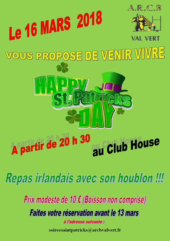 Réservations jusqu'au Mardi13 Mars par courriel à l'adresse suivante soireesaintpatricks@arcbvalvert.fr